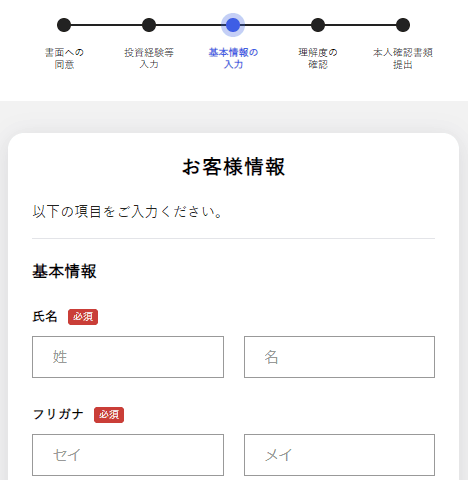 各種規約への同意と、投資家情報の入力をしていきます。流れはこのようになります。