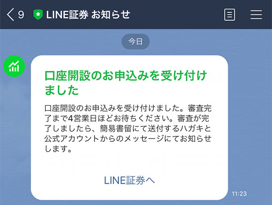 完了画面にも記載されていますが、4営業日ほどで口座が開設されて、完了したらハガキとメッセージで知らせが来ます。