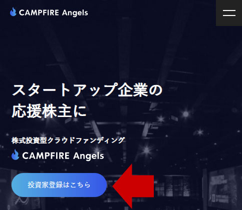 まずはCAMPFIRE Angelsの公式サイトから「投資家登録はこちら」のボタンを押します。