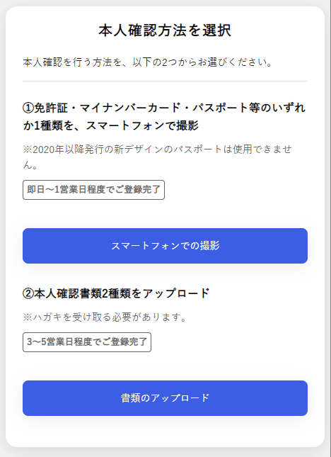 「アップロード」の場合は、本人確認書類を撮影やスキャンしたものをアップロードします。本人確認書類が2種類必要で、アップロード後にハガキを受け取る必要があり、投資家登録の完了まで3〜5営業日程度かかります。