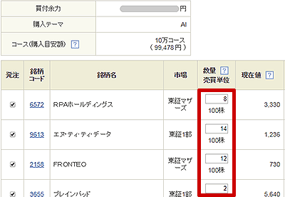 注文画面では銘柄ごとに買う・買わないの選択や、銘柄ごとに買う数量を自分で変えることも可能です。